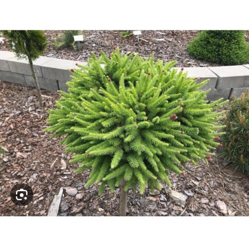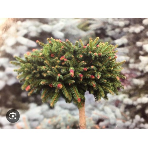 Карликовый, густой, регулярный, плоско-шаровидный сорт. Отличительной особенностью данной вариации являются многочисленные, ярко-красные шишки на концах побегов. (Улучшенный Pusch).